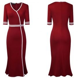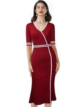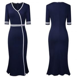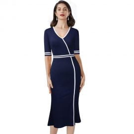 Women’s Pencil Dress V-neck White Stitching Wave Hem Midi Bodycon Dress