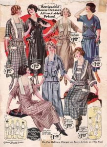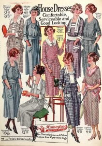 A woman in the 20s would spend the largest share of her time in a house dress because her role was primarily that of a housewife. This called for a practical and comfortable dress. It was usually a simple cotton dress with a white-collar. This dress was slipped on or removed over the head. A woman would sew several house dresses for herself because they were very easy to make.