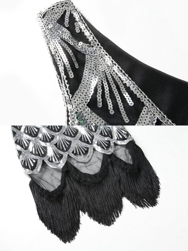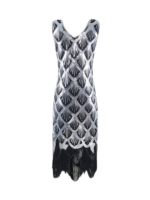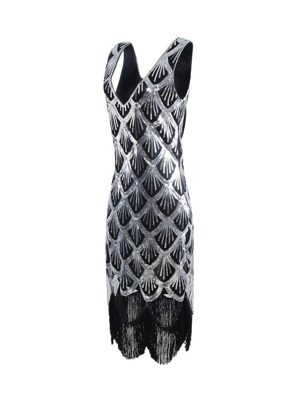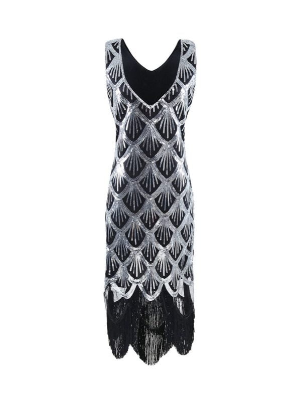 1920s Evening Gown V Neck Blackless Fringed Dance Dress
