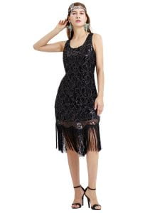 Women’s Vintage Dress O Neck Sequin Fringe Flapper Dress for 1920s Party