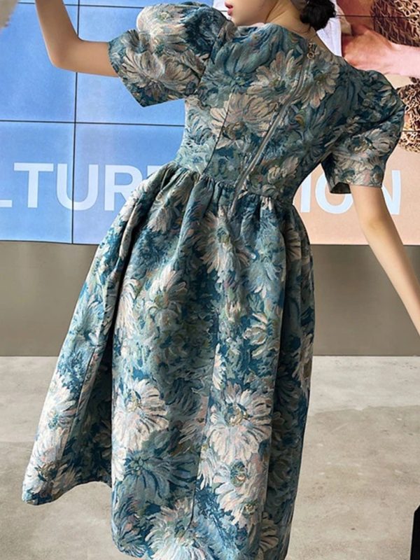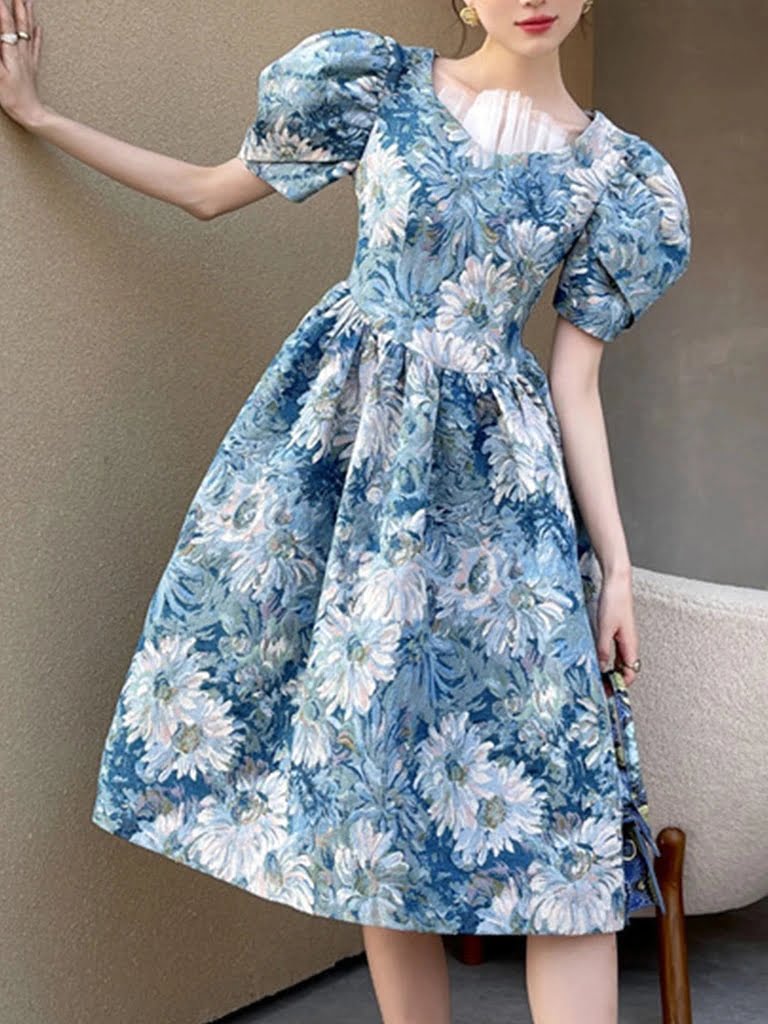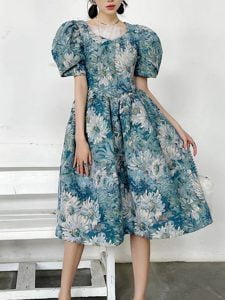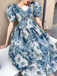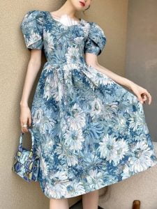 - Features: This 1950s Dress. with Daisy Floral Printed. PalaceStyle. Puff Sleeve. Sweetheart Neckline. A-Line. Tie Waist. Hidden Zip at Back. Unlined;