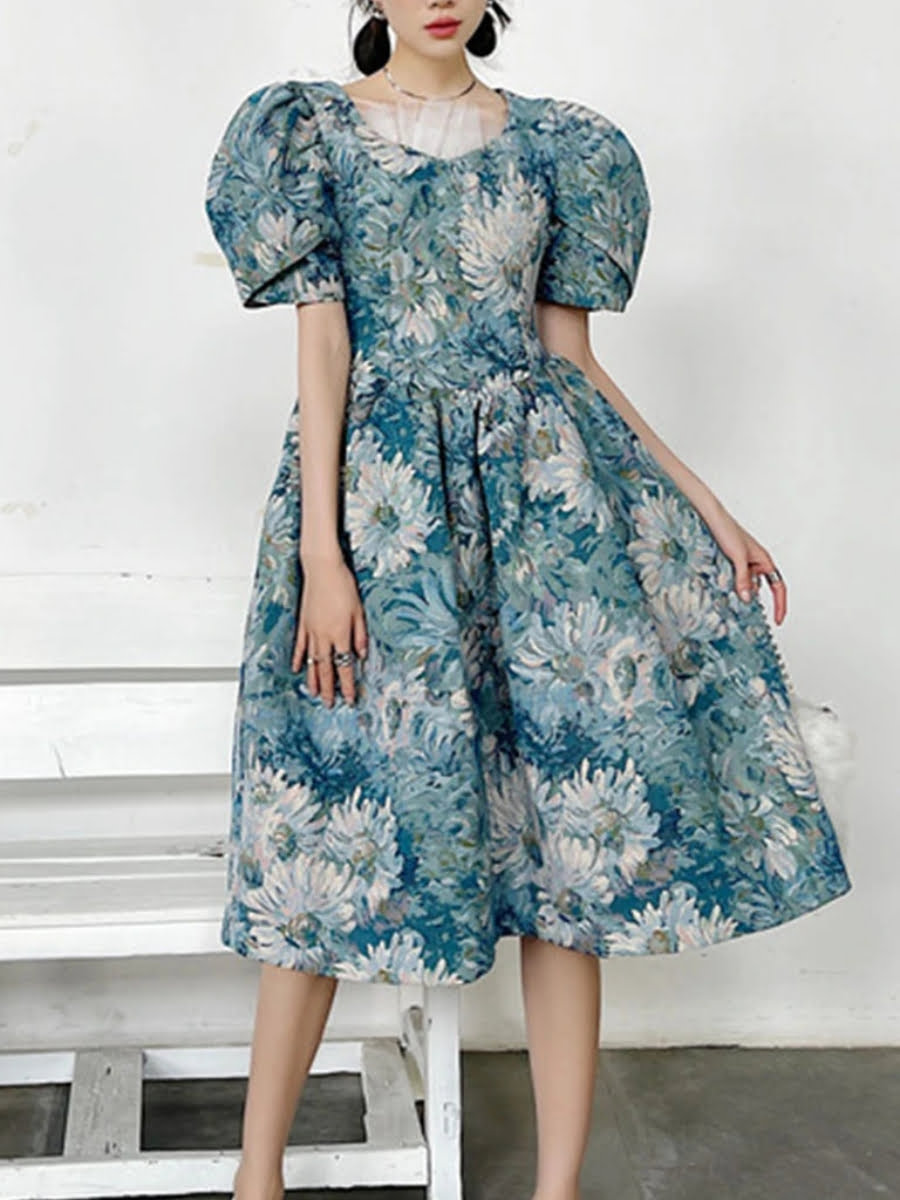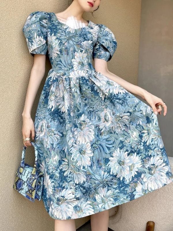 1950s Dress Blue Daisy Painting Puff Sleeve Tie Waist Vintage Dresses