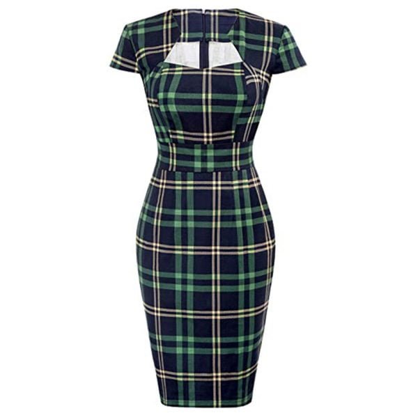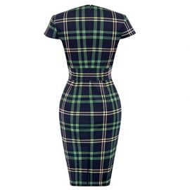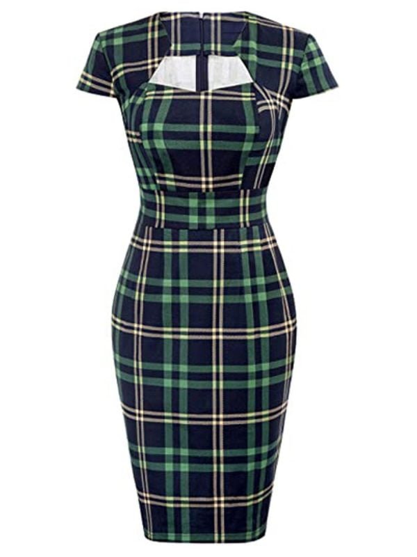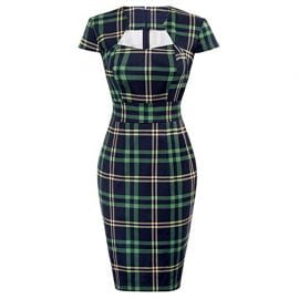 1950s Dress Hollow Neck Plaid Short Sleeve Split Midi Pencil Dress