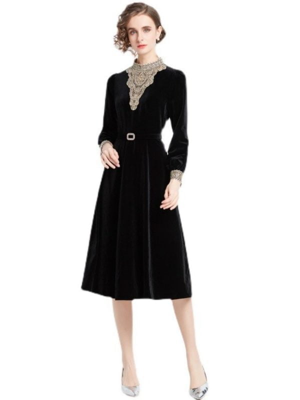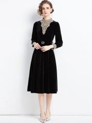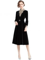 1950s Dress Lace Embroidery Stand-up Collar Midi Swing Velvet Dress