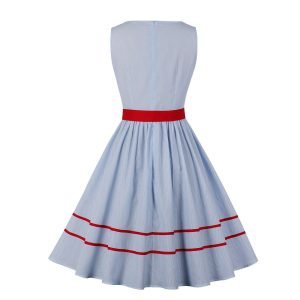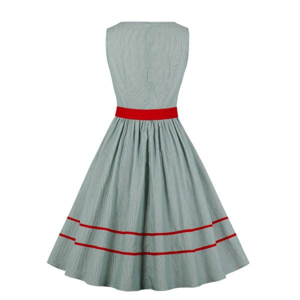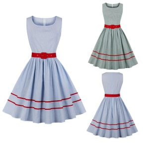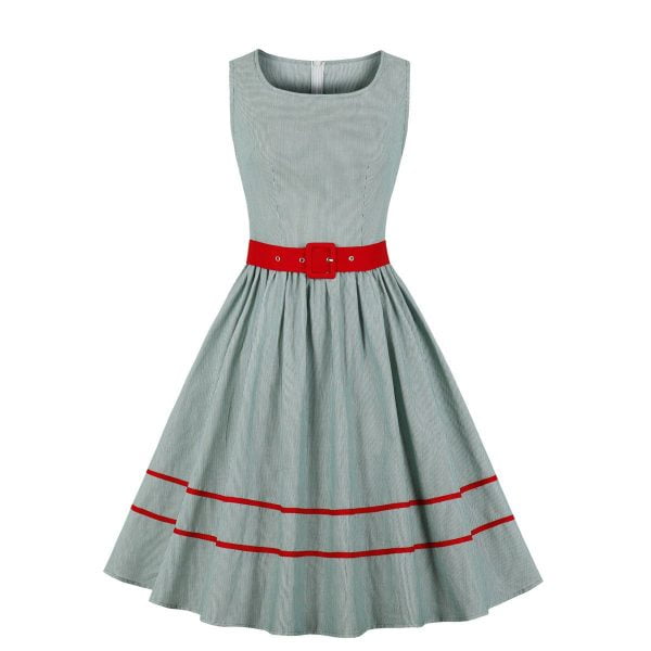 - Features: This 1950’s Dress. with vintage style. sleeveless design. round neck. two stripes color-block pattern. and with a red frenulum on the waist and a big swing type. which all bring more temperament to this formal dress;