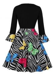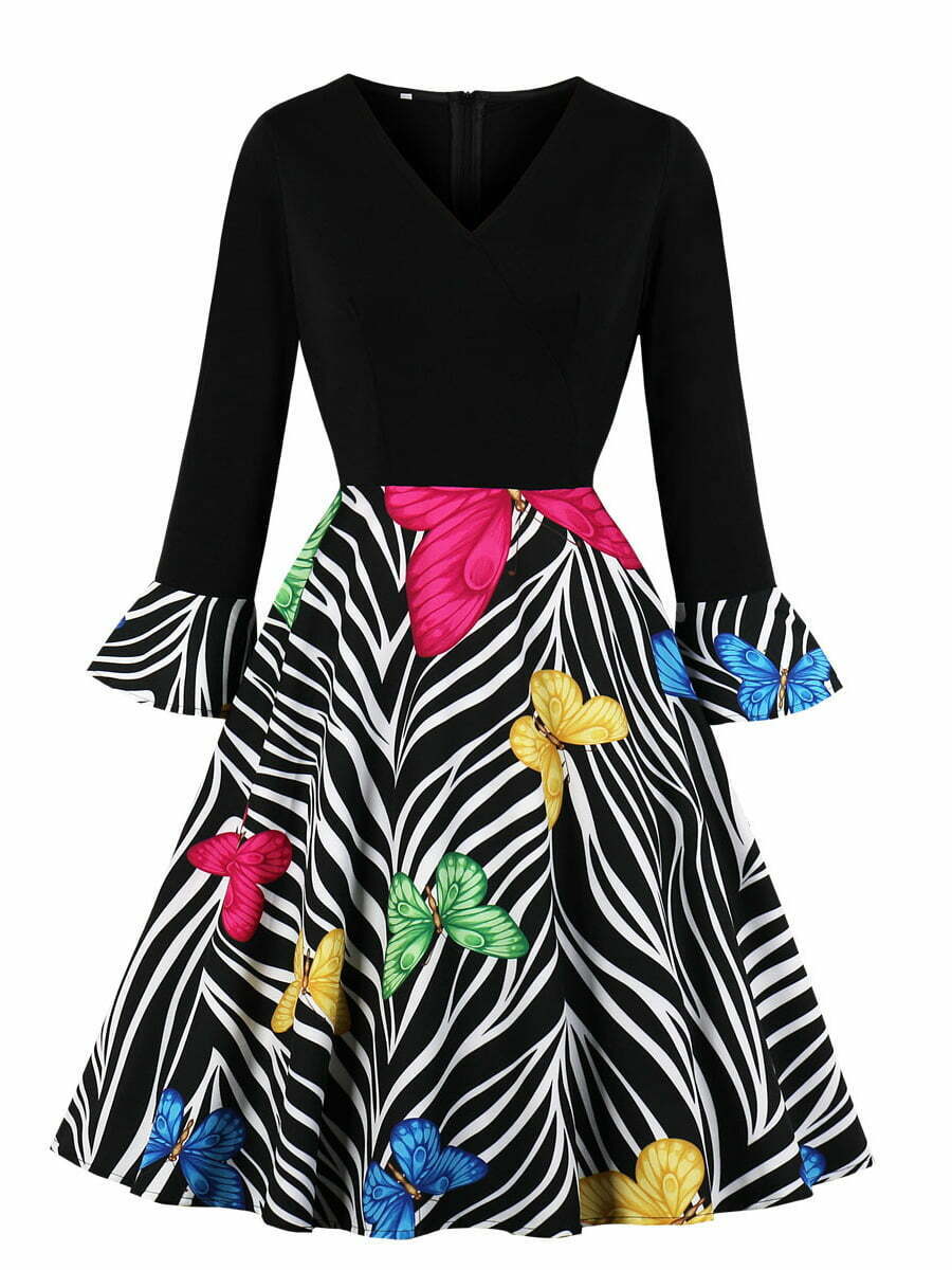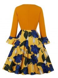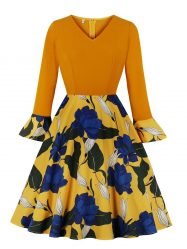 1950s Dress V-neck Stripe Floral Patchwork Long Sleeve Midi Swing Dresses
