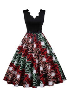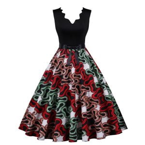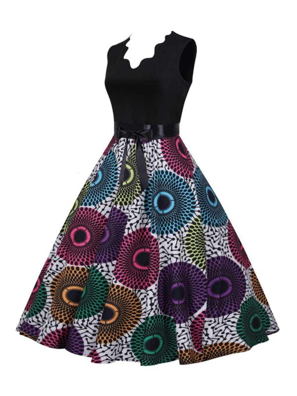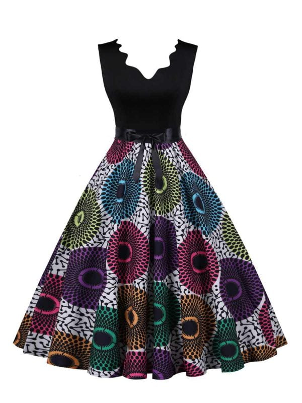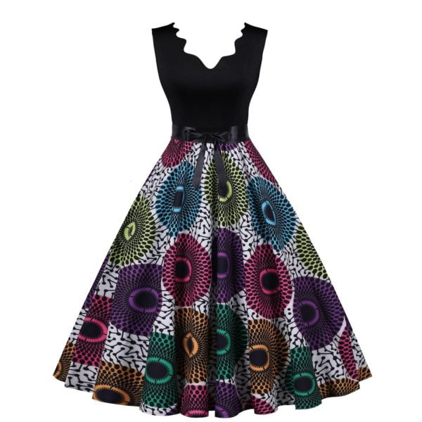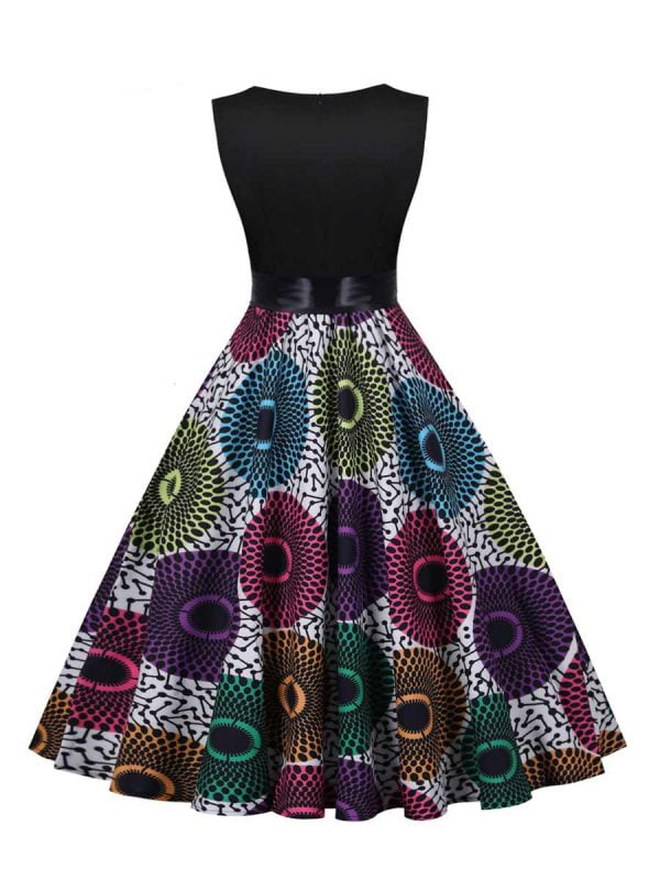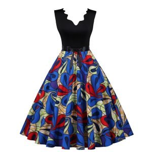 Women’s dress has a unique design of V-neck. sleeveless. and black colorblock floral;