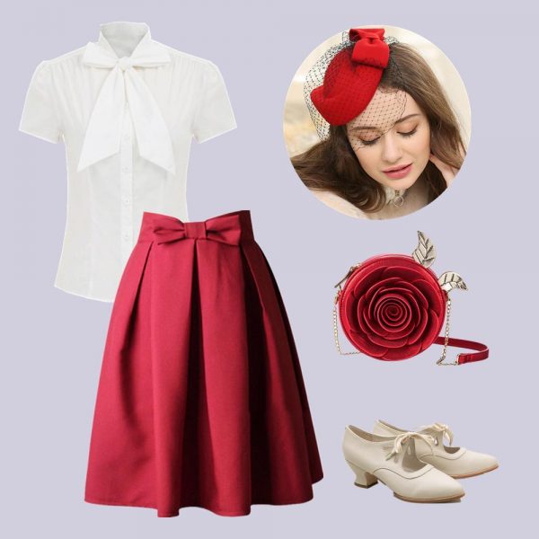3Pcs/Set Vintage Bow Tie Shirt+50s Aline Skirt+Pillbox Hat