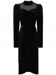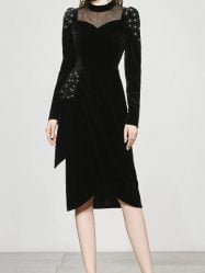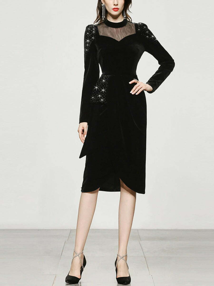 Black Dress Retro Hepburn Rhinestone Mesh Stitching Irregular Hem Velvet Dress