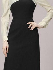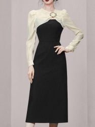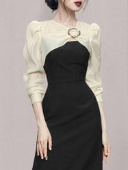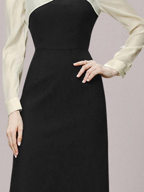 Black Dresses Contrasting Color Mesh Patchwork Long Sleeve Button Pencil Dresses