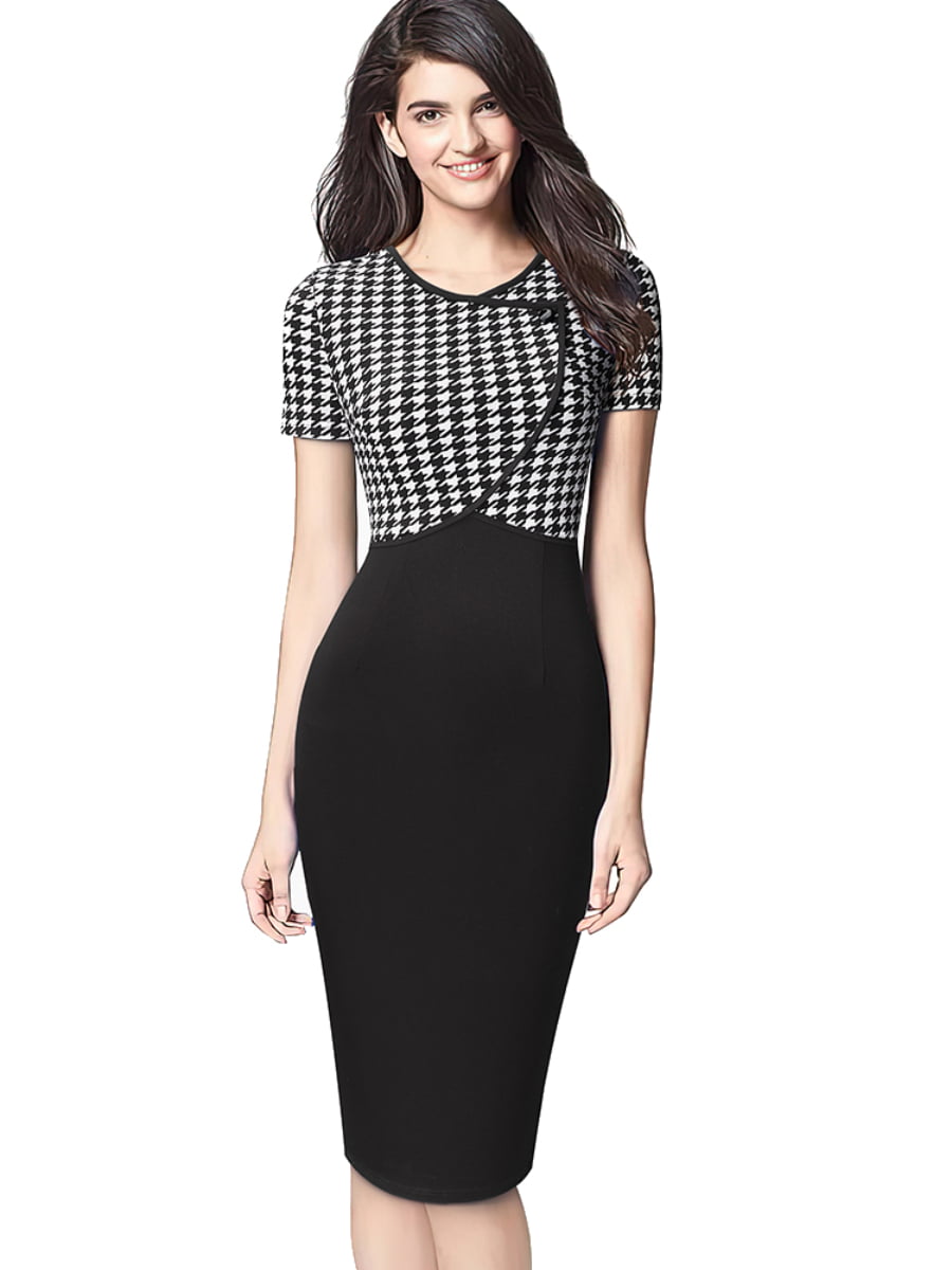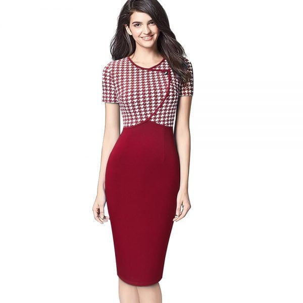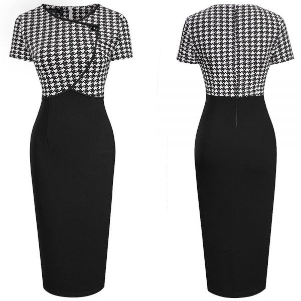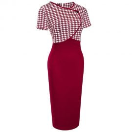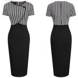 Wrap v neck design creates a sexy front and gorgeous back look; Pencil dress modifies beautiful sexy leg shape. makes your more sexy and attractive; Unique houndstooth stitching adds mystery to you;