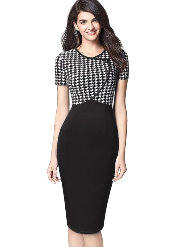 Bodycon Dress For Women Cross V-neck Houndstooth Stitching Vintage Bodycon Dress