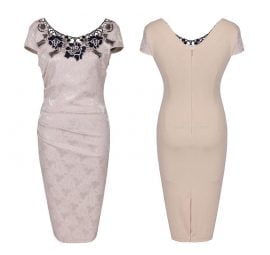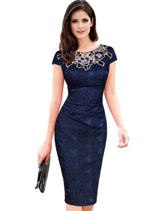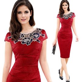 Bodycon Dresses Round Neck Lace Flower Embroidery Patchwork Neck Midi Dress