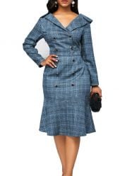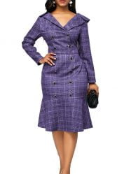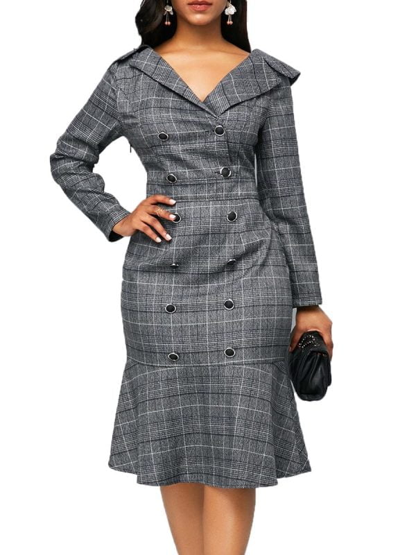 Bodycon Dresses V-neck Double-breasted Plaid Long Sleeve Plus Size Midi Dresses