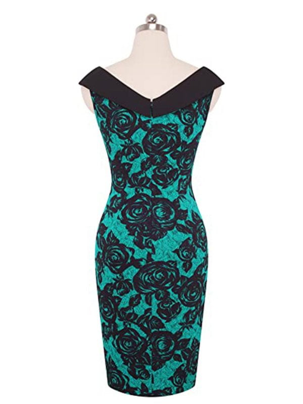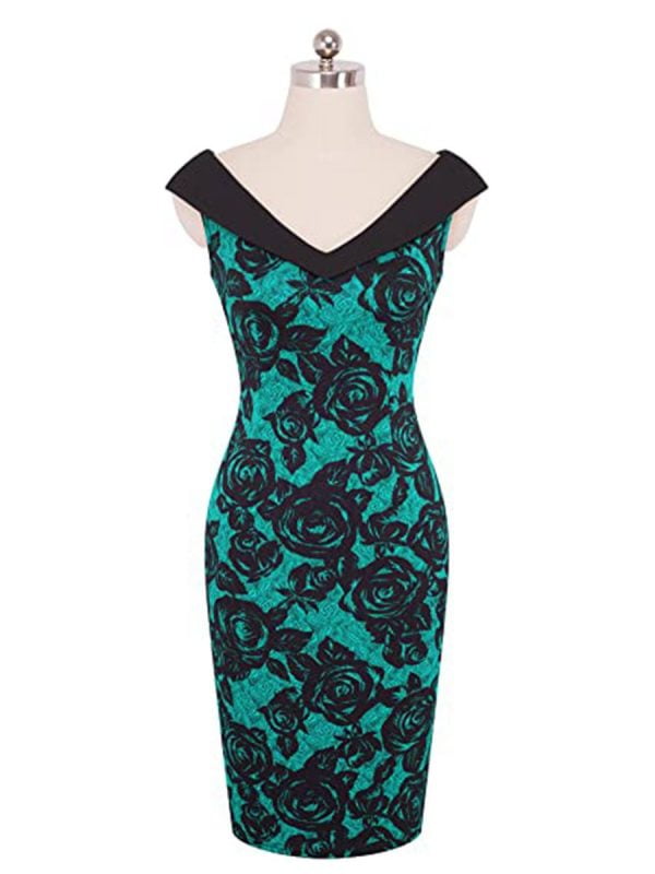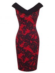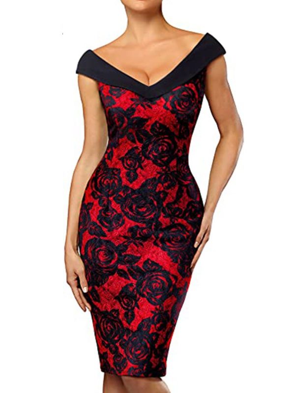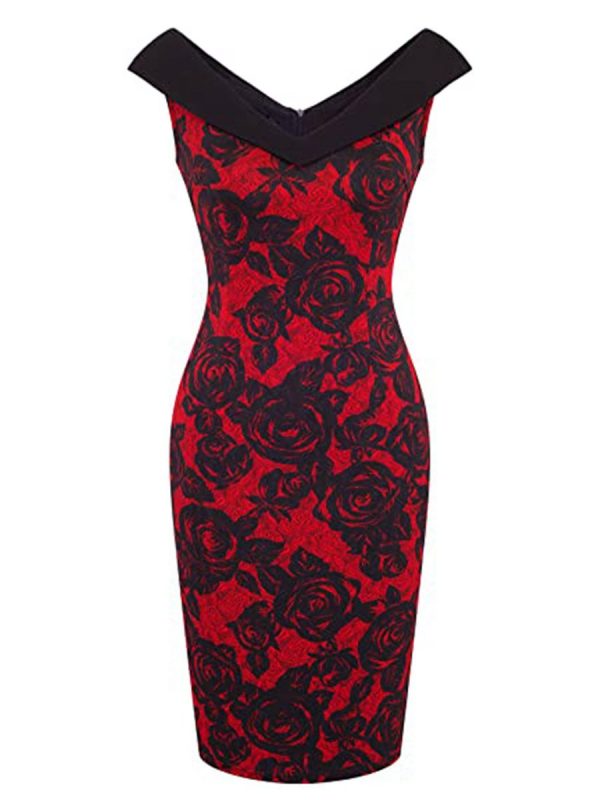 This sleeveless. lapel v-neck. red&black floral print knee-length bodycon dress. that could be dressed up or down depending on the occasion: for example. worn for daytime business. church. or for an evening cocktail. party. and wedding occasions.