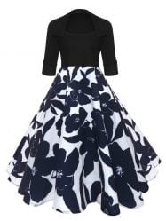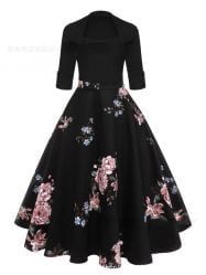 Dresses For Wedding Guests Vintage Floral Print Midi Sleeve Swing Dresses