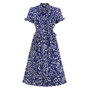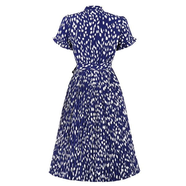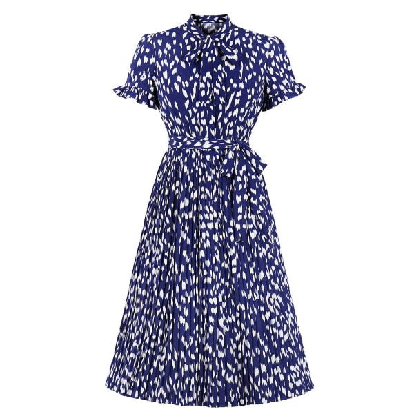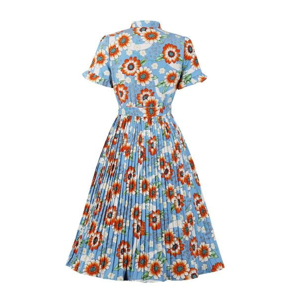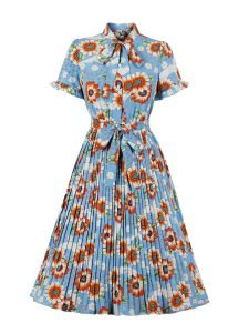 - Features: Short sleeve; Round collar with tie; Floral printed; Pleated style; Elastic tie waist; Knee -length;