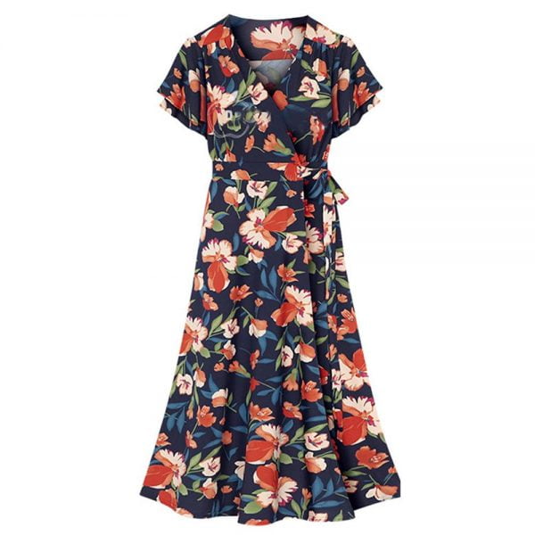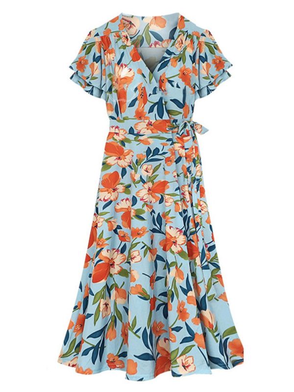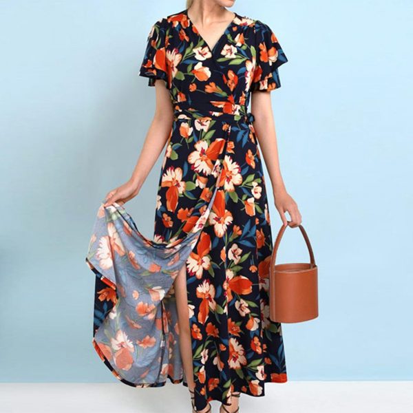 - Features: Beach dress. Vintage floral print. Frenulum tie waist. V Neck. A-Line long dress. Ruffle sleeve. Elastic high waist. Maxi ankle length. Boho swing dress. Flowy elegant. Casual vacation style;