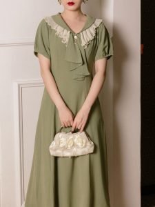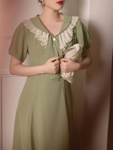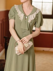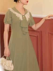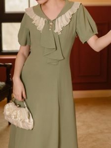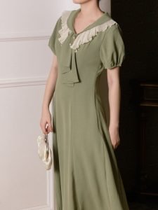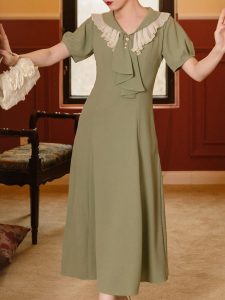 Green Ruffles Scarf Collar Puff Sleeve 1950S Swing Vintage Dress