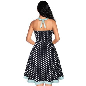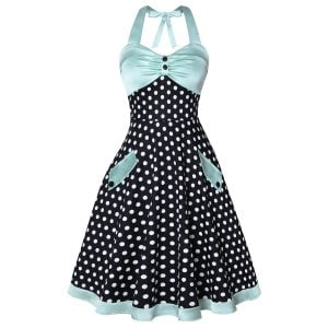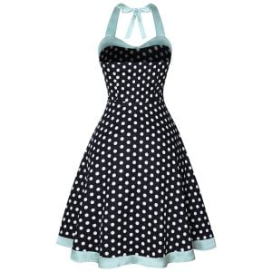 Categories: 1950s Dresses, Halter Dress, Polka Dot Dress