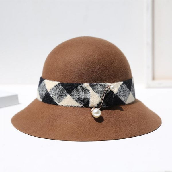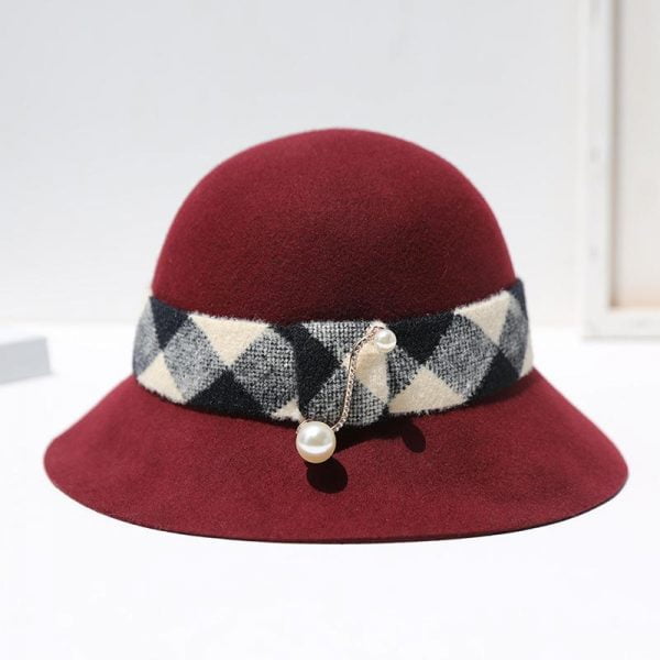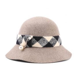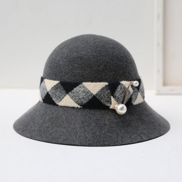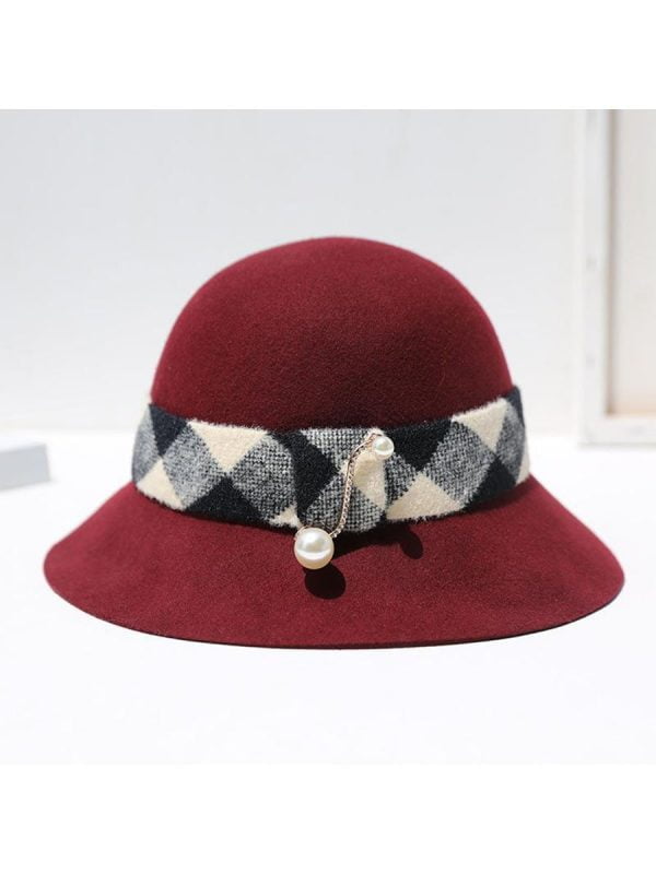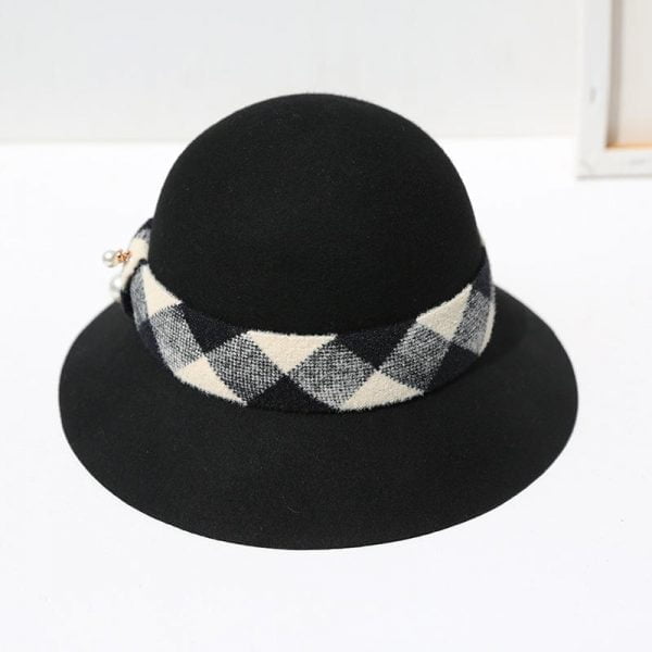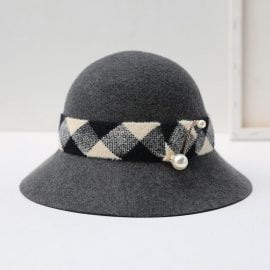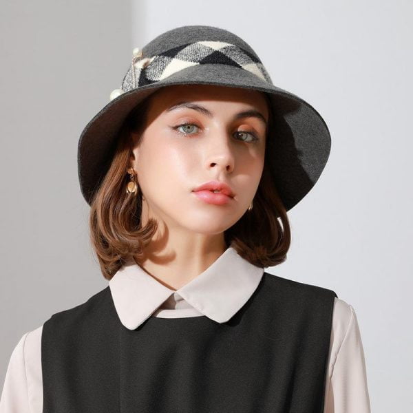 Knitted Hat Houndstooth Pattern Pearls Wool Elegant Bucket Hat