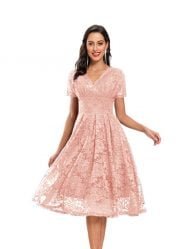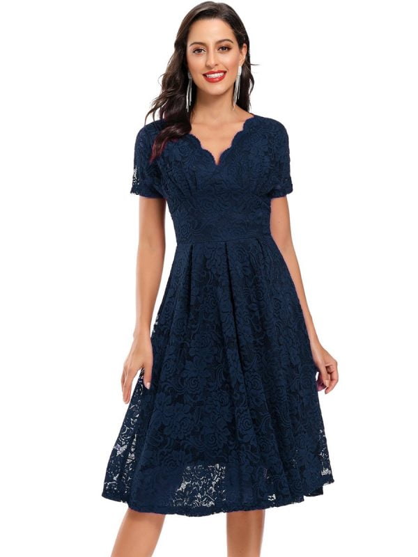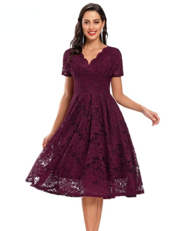 Lace Dresses Deep V-neck Short Sleeve High Waist Midi Swing Dresses