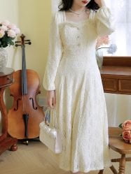 Lace Dresses Vintage Square Neck Lantern Sleeve Maxi Swing Dresses