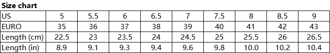 Note: Please compare the detail sizes with yours. make sure you choose the correct size before purchase. If your feet are a little fat and wide. it is recommended to choose a larger size. thanks.