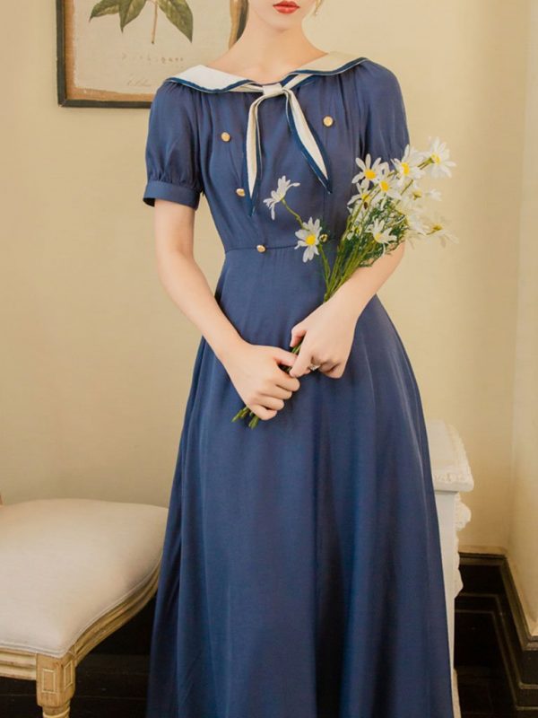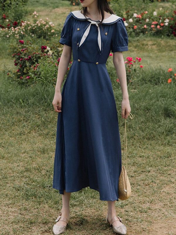 Navy Blue Sailor Collar Puff Sleeve Swing Dress