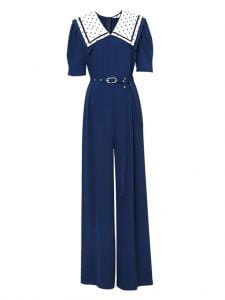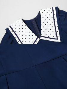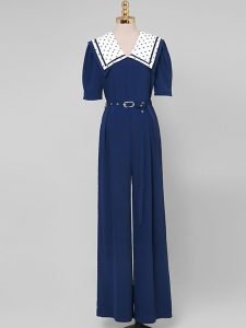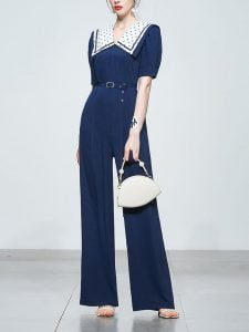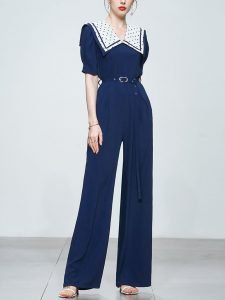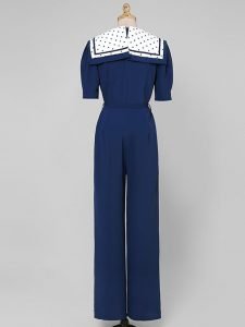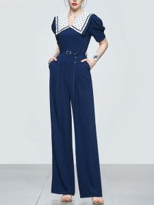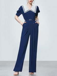 Navy Ploka Dots Sailor Collar Puff Sleeve Jumpsuit With Belt