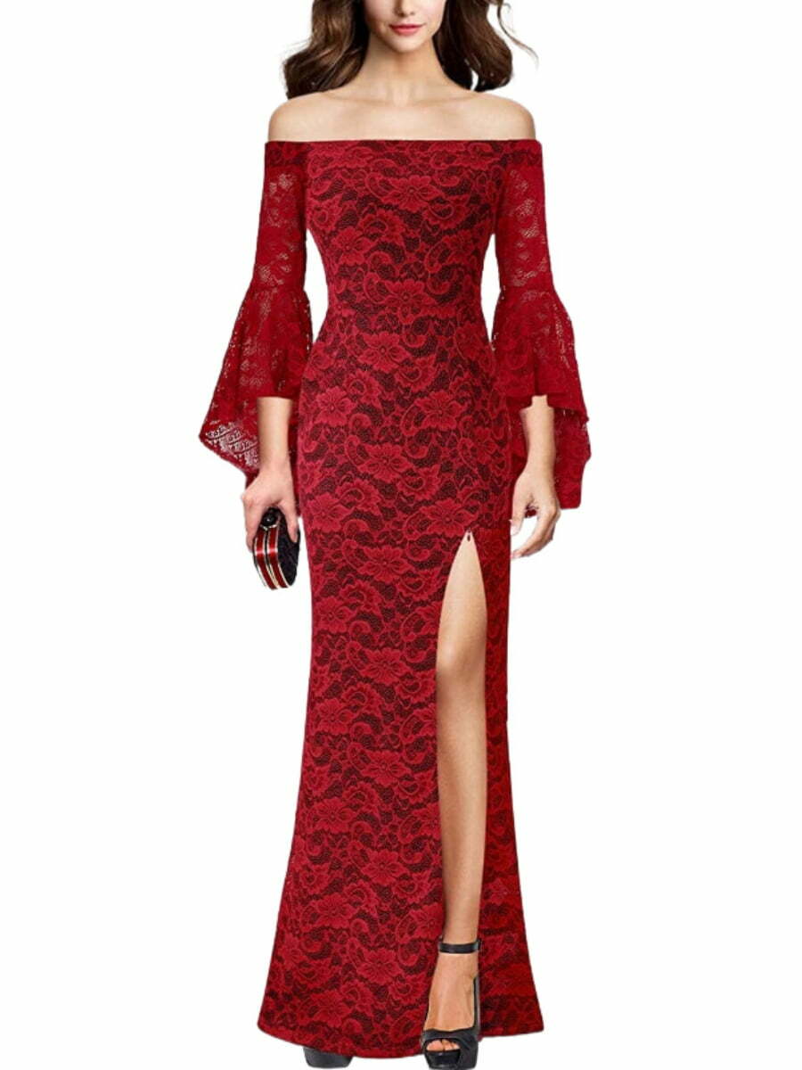 Off The Shoulder Dress Lace Flared Sleeves Split Maxi Dress