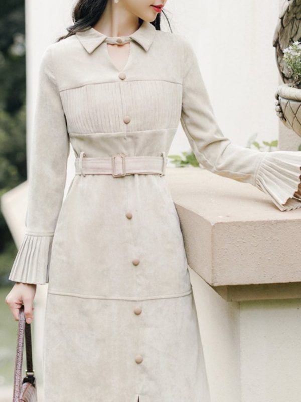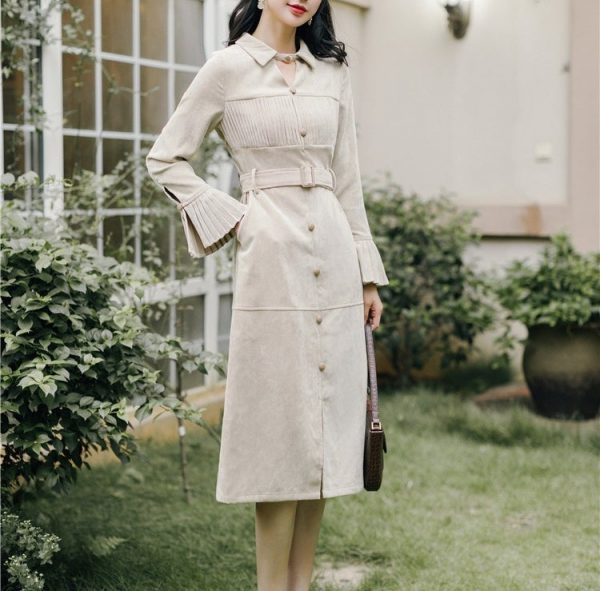 The designed hollow neckline and pleated flared sleeves make this dress unique and fashionable; The corduroy material is soft. comfortable. and warm;
