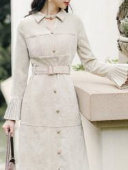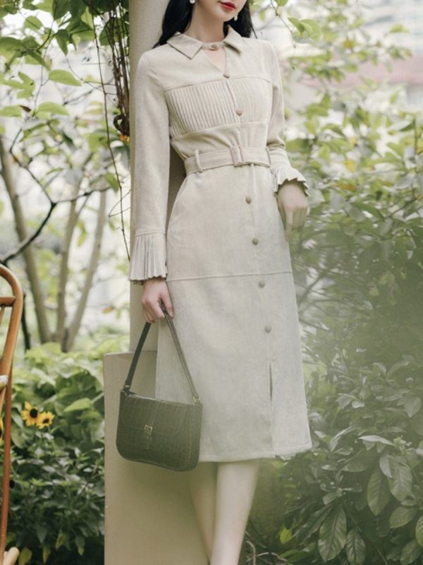Pencil Dresses Corduroy Flared Sleeve Single Breasted Lapel Belt Maxi Dress