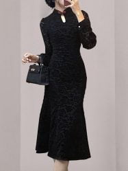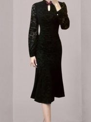 Pencil Dresses Stand-up Collar Hollow Lace Buckle Slim Mermaid Dress