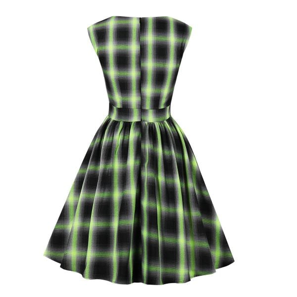 The Plaid Dress. with sleeveless design. round neck. pleated hem. a big swing type. fluorescent green bright color;