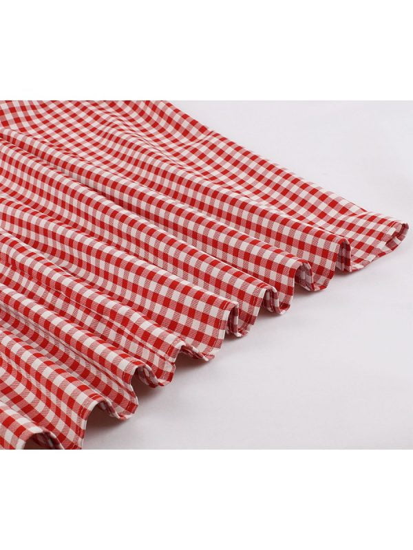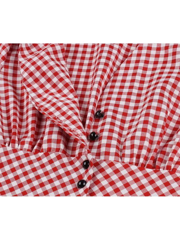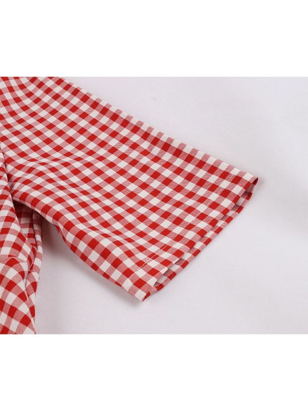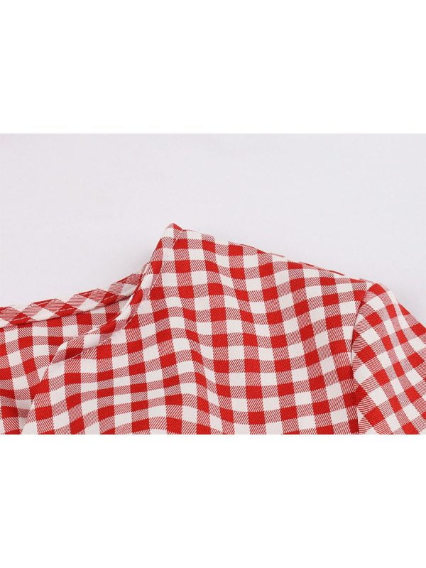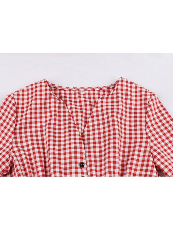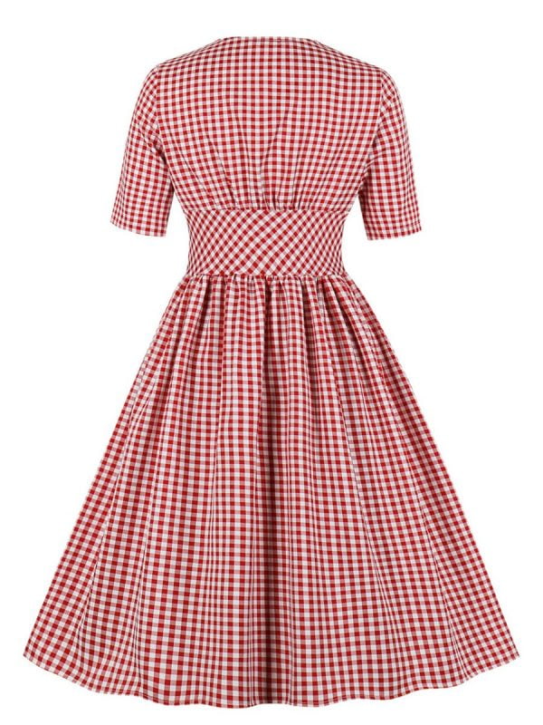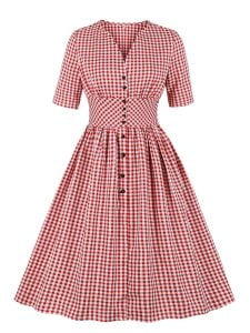 vintage-dress-plaid-v-neck-half-sleeve-midi-dress