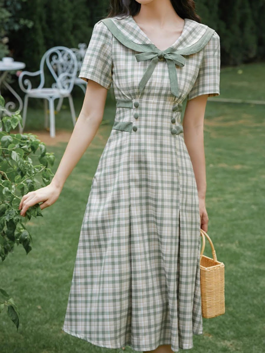 - Plaid pattern. sailor collar. short sleeve. bowknot decor. button tie-waist. swing hemline;