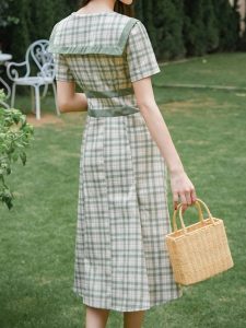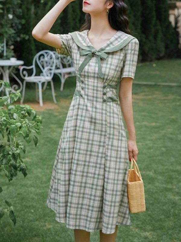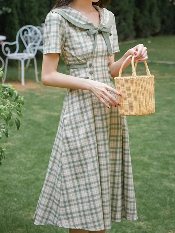 - Plaid pattern. sailor collar. short sleeve. bowknot decor. button tie-waist. swing hemline;