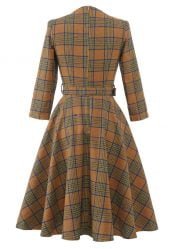 Plaid Dresses Retro Three Quarters Sleeve Lace-up Bowknot Winter Dress