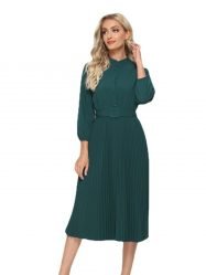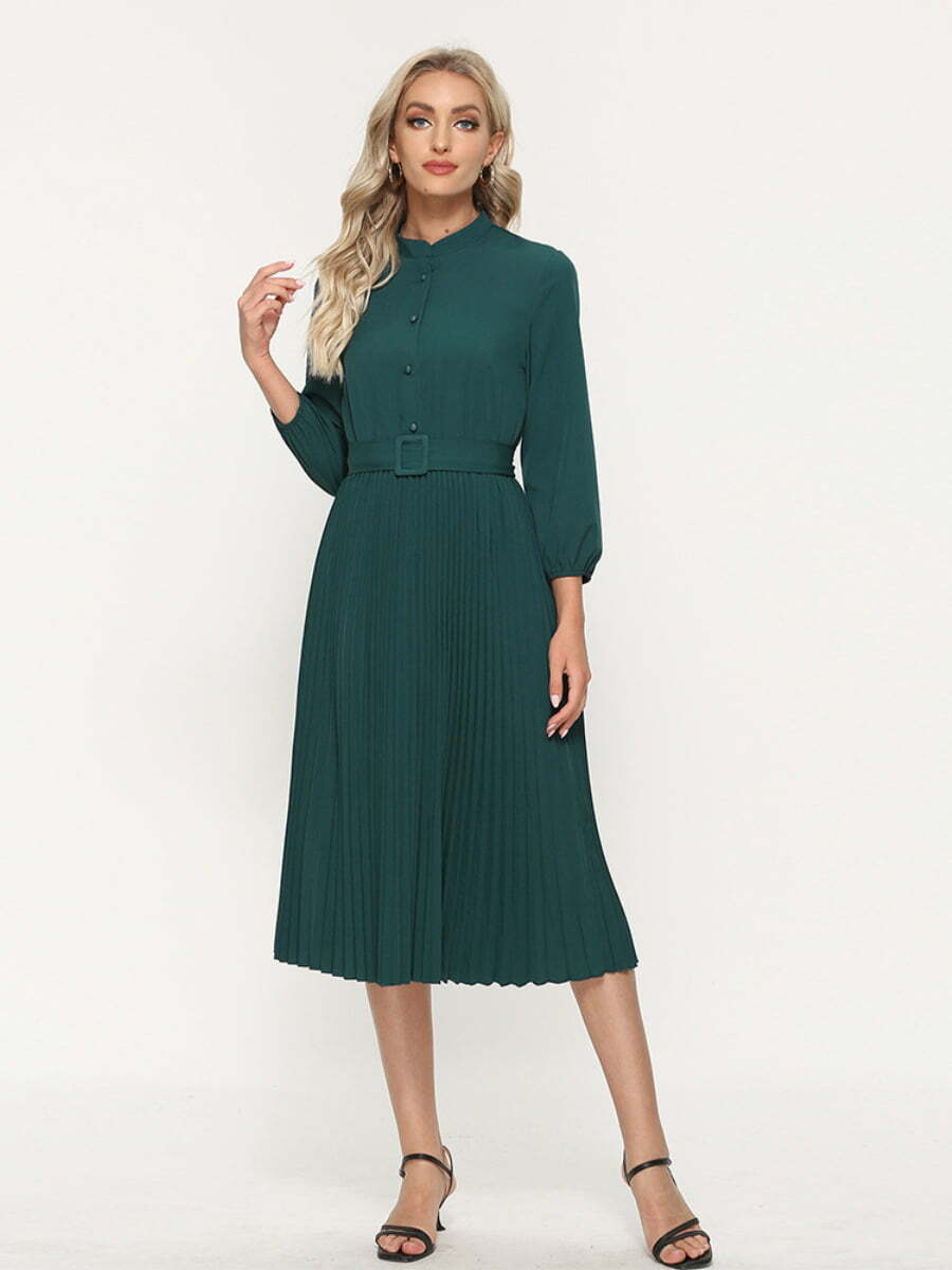 Pleated Dress Round Neck Lantern Sleeve Single Breasted Belt Midi Dress