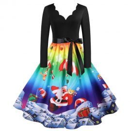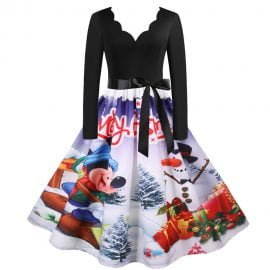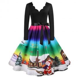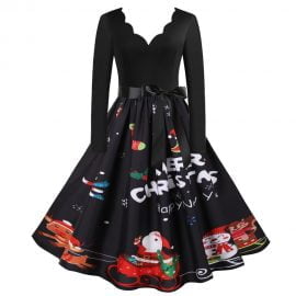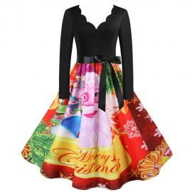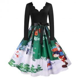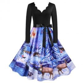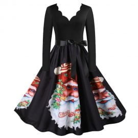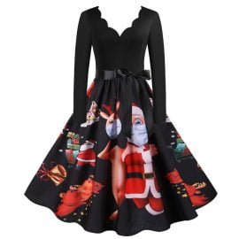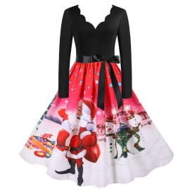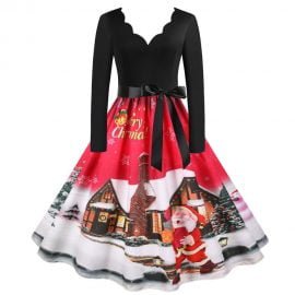 Plus Size Christmas Dress Petal Neckline Long Sleeve Bowknot Midi Swing Dress