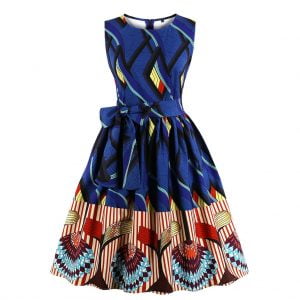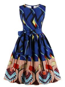 Plus Size Dress Sleeveless Round Neck Retro Printed Bow Long Dress