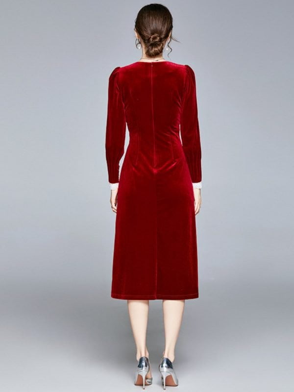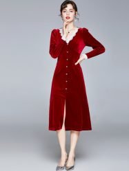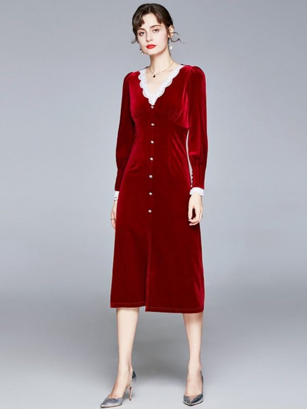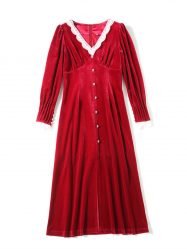 Red Dress Lace Stittching V-neck Puff Sleeve Single Breasted Midi Dress