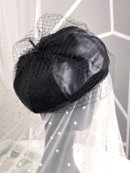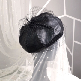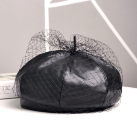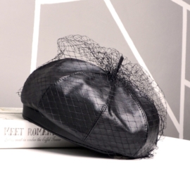 Retro Beret Hat Mesh PU Leather British Style Black Hat