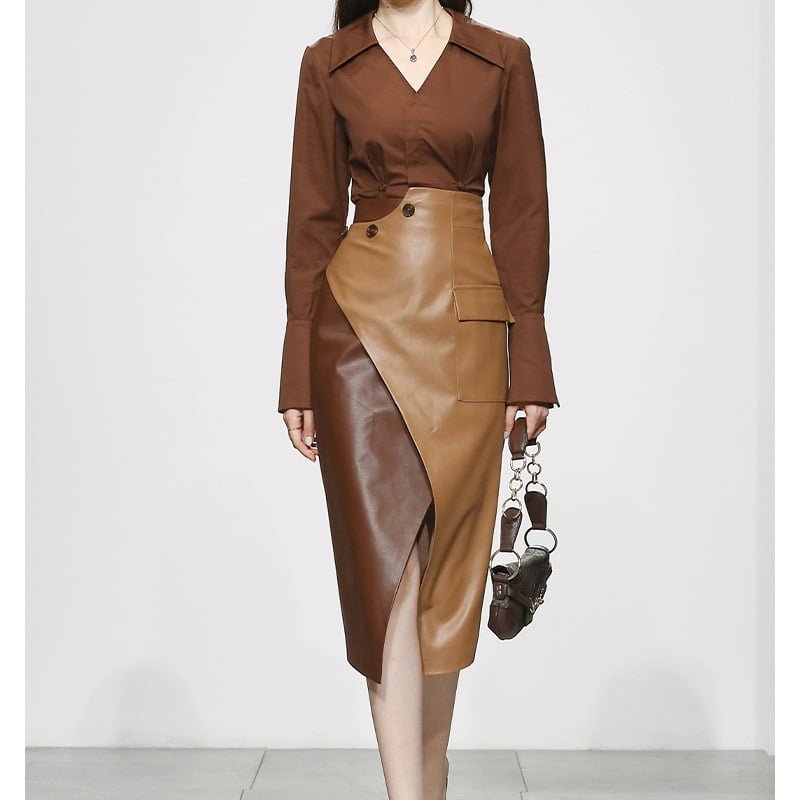Skirt Suit V-neck Shirt PU Color Patchwork Pocket Split Two Piece Dresses
