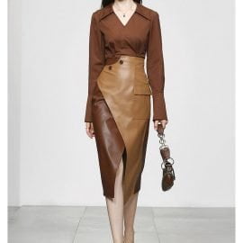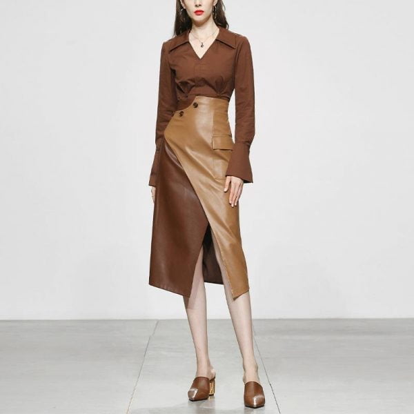 Skirt Suit V-neck Shirt PU Color Patchwork Pocket Split Two Piece Dresses