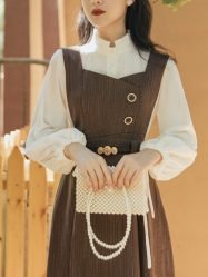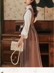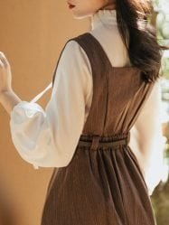 The cute shirt is paired with a suspender skirt. retro and fashionable. and the classic collocation will not be out of date; The swing skirt with an exquisite belt will perfectly show your charm;