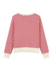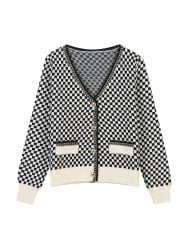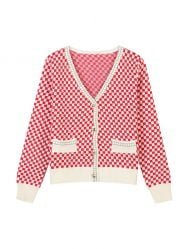 Sweater Cardigans V-neck Long Sleeve Checkerboard Pocket Loose Knitted Sweaters