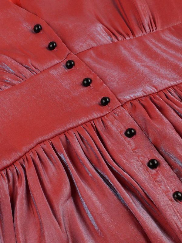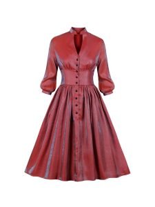 Swing Dress Deep V Neck Buttons Design Lantern Sleeve Aline Dress