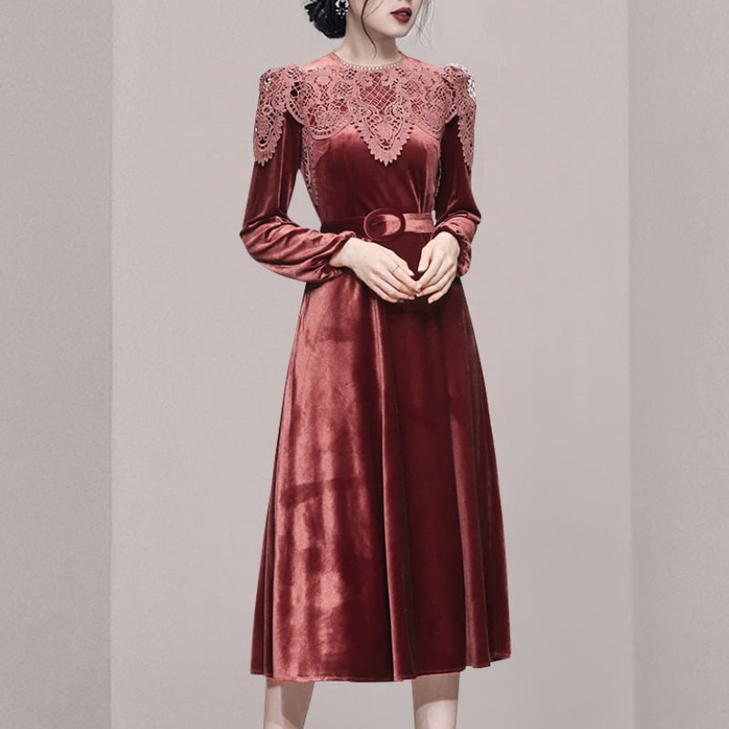 The unique lace stitching neckline makes this dress more retro; The high-quality velvet material is not only warm and comfortable. but also makes this dress more luxurious;